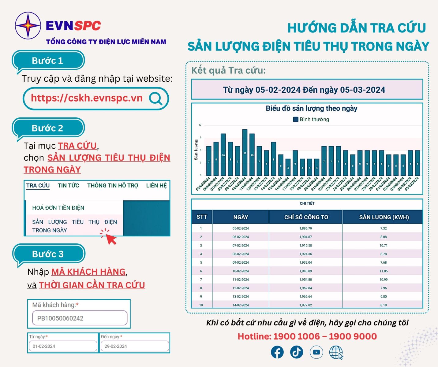 Truy cập vào trang web sau: https://cskh.evnspc.vn/ và làm theo các bước như hình hướng dẫn nhé!