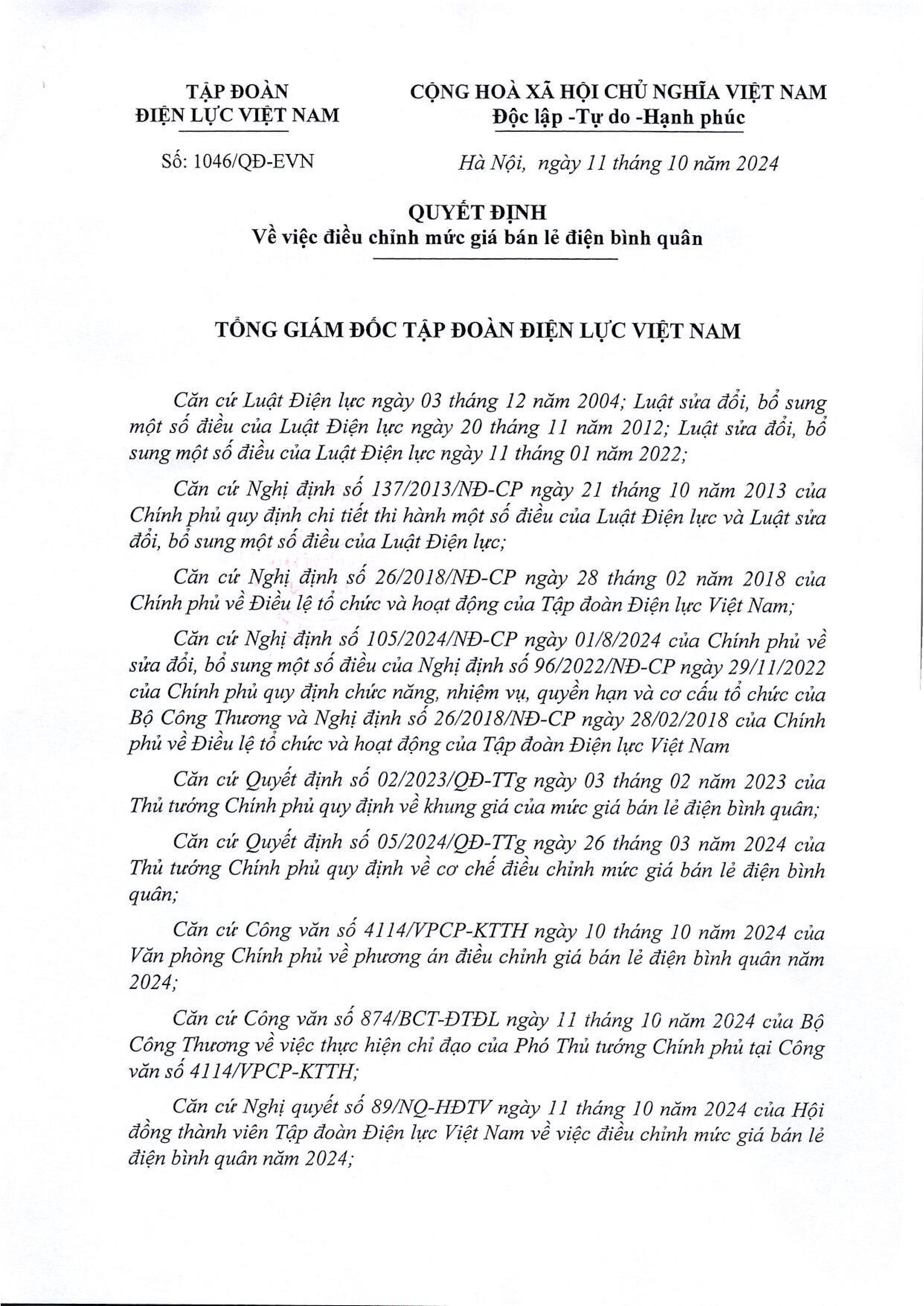Quyết định số 1046/QĐ-EVN về việc điều chỉnh mức giá bán lẻ điện bình quân
