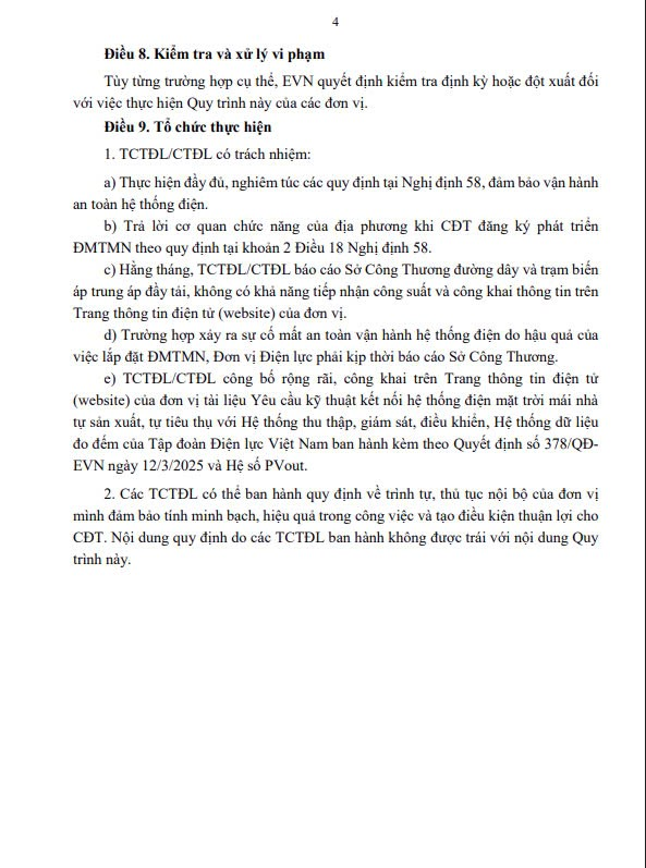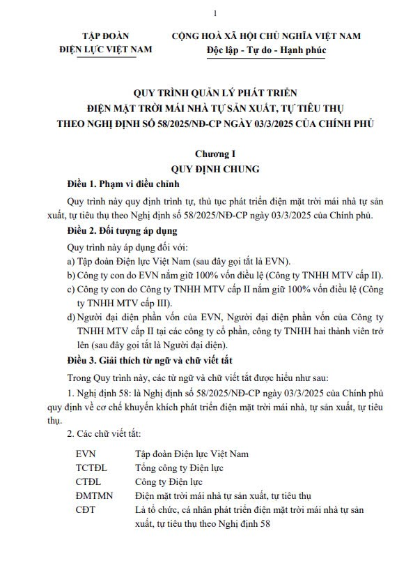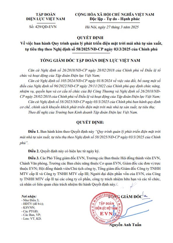 Quyết định về việc ban hành Quy trình quản lý phát triển điện mặt trời mái nhà tự sản xuất, tự tiêu thụ theo Nghị định số 58/2025/NĐ-CP ngày 03/3/2025 của Chính phủ