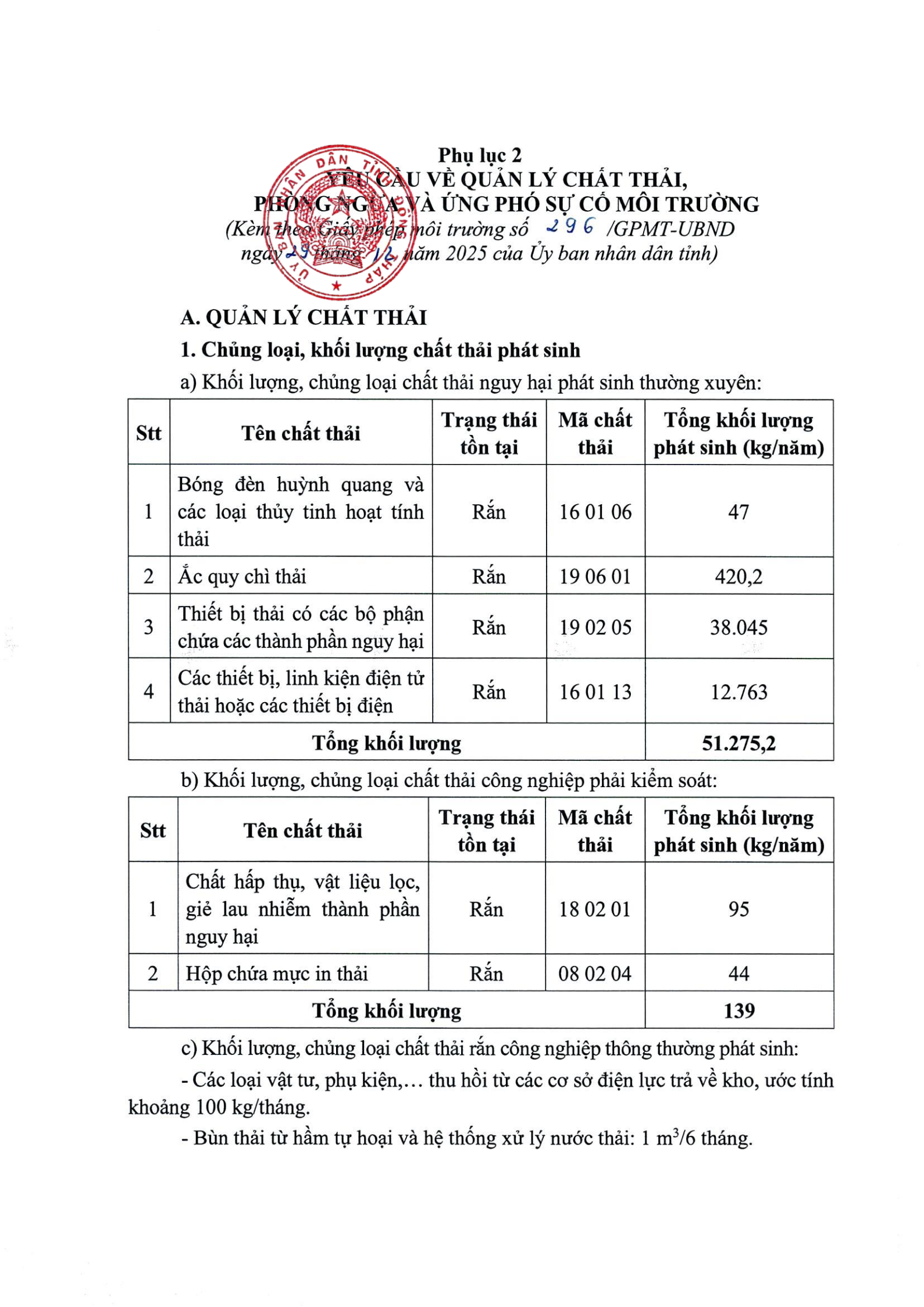 Giấy phép môi trường số 296/GPMT-UBND ngày 29 tháng 12 năm 2025 của UBND...